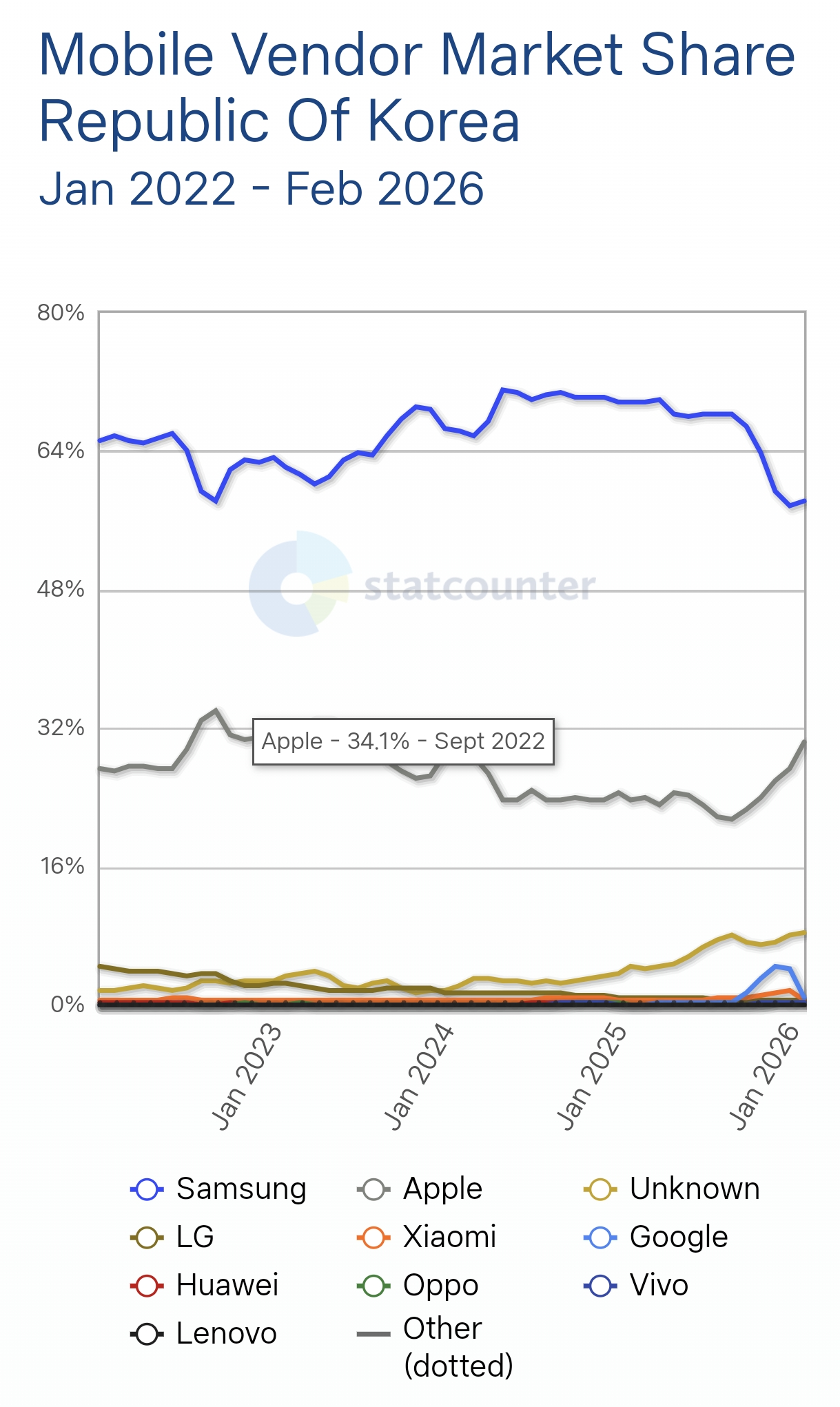 Statcounter 자체가 특정 웹사이트에 접속한 기기 정보를 트래킹하는 통계방식이라 해당 업체 정보를 소스로 쓰는건 전형적인 어그로. 저 사이트 정보대로라면 현재 한국에는 국내에 출시도 하지 않은 구글 스마트폰 점유율이 4% 인 상태고, 회사를 알 수 없는 언노운 브랜드도 9% 점유율인 상태임