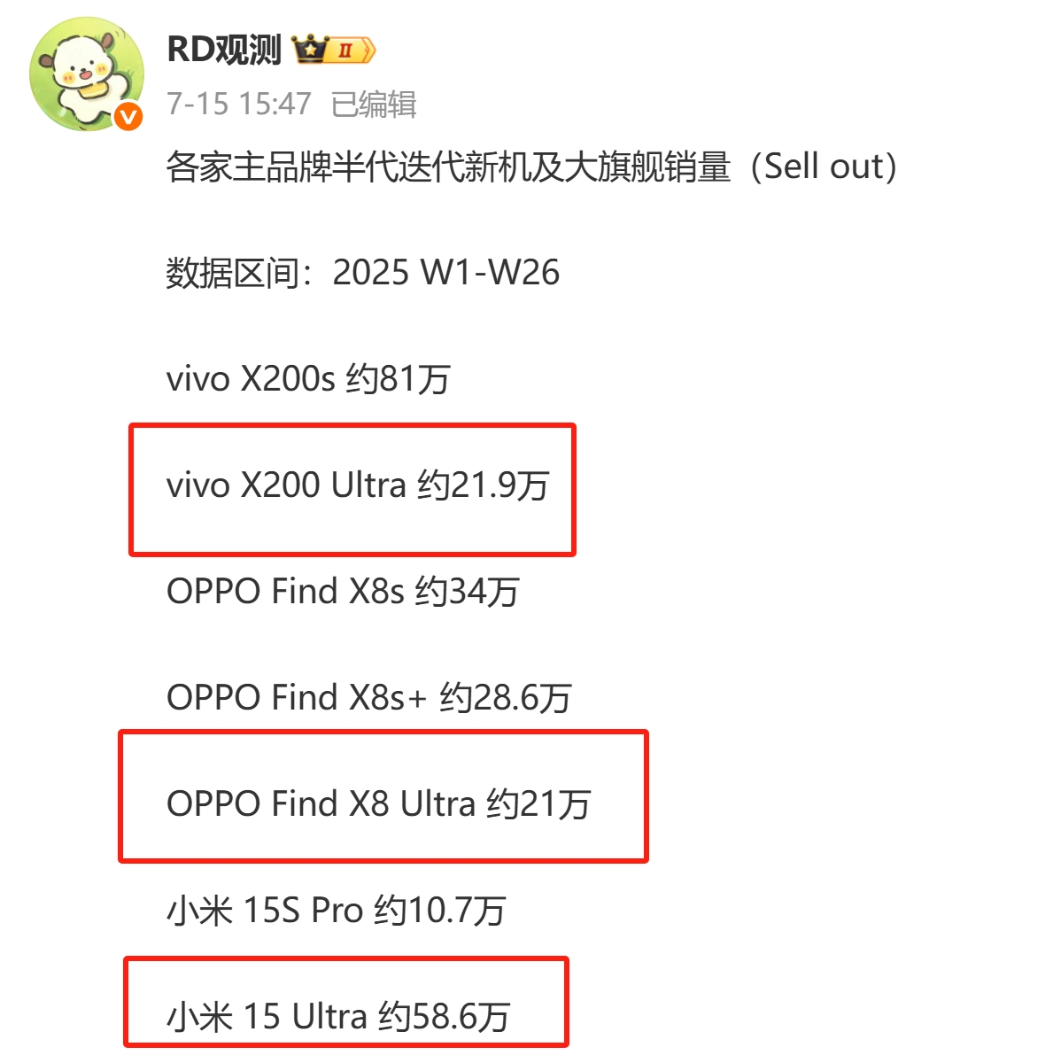플래그십 시리즈 기준 오포와 비보보단 많이 팔리지만 글로벌 출시까지 한 15 울트라의 반년 누적 판매량이 58만대, 중국 플래그십 폰들의 목표가 100만대 판매임 | 25.09.23 12:29 | | |