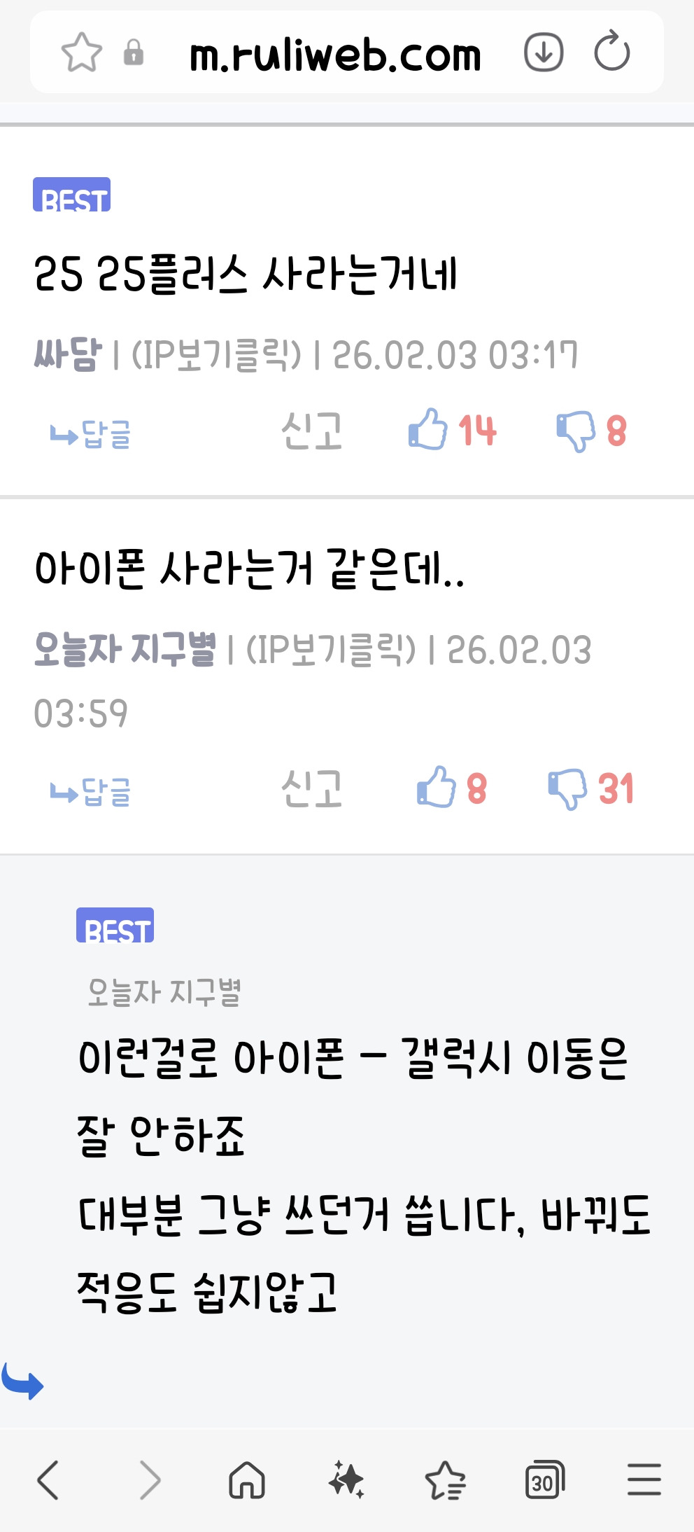 이런걸로 아이폰 - 갤럭시 이동은 잘 안하죠 대부분 그냥 쓰던거 씁니다, 바꿔도 적응도 쉽지않고 아이폰 쓰던 사람이 갤럭시 쓰면, 갤럭시 쓰던 사람이 아이폰 쓰면 뭐 다 불편해합니다 ㅋㅋㅋ | 26.02.03 07:54 | | |