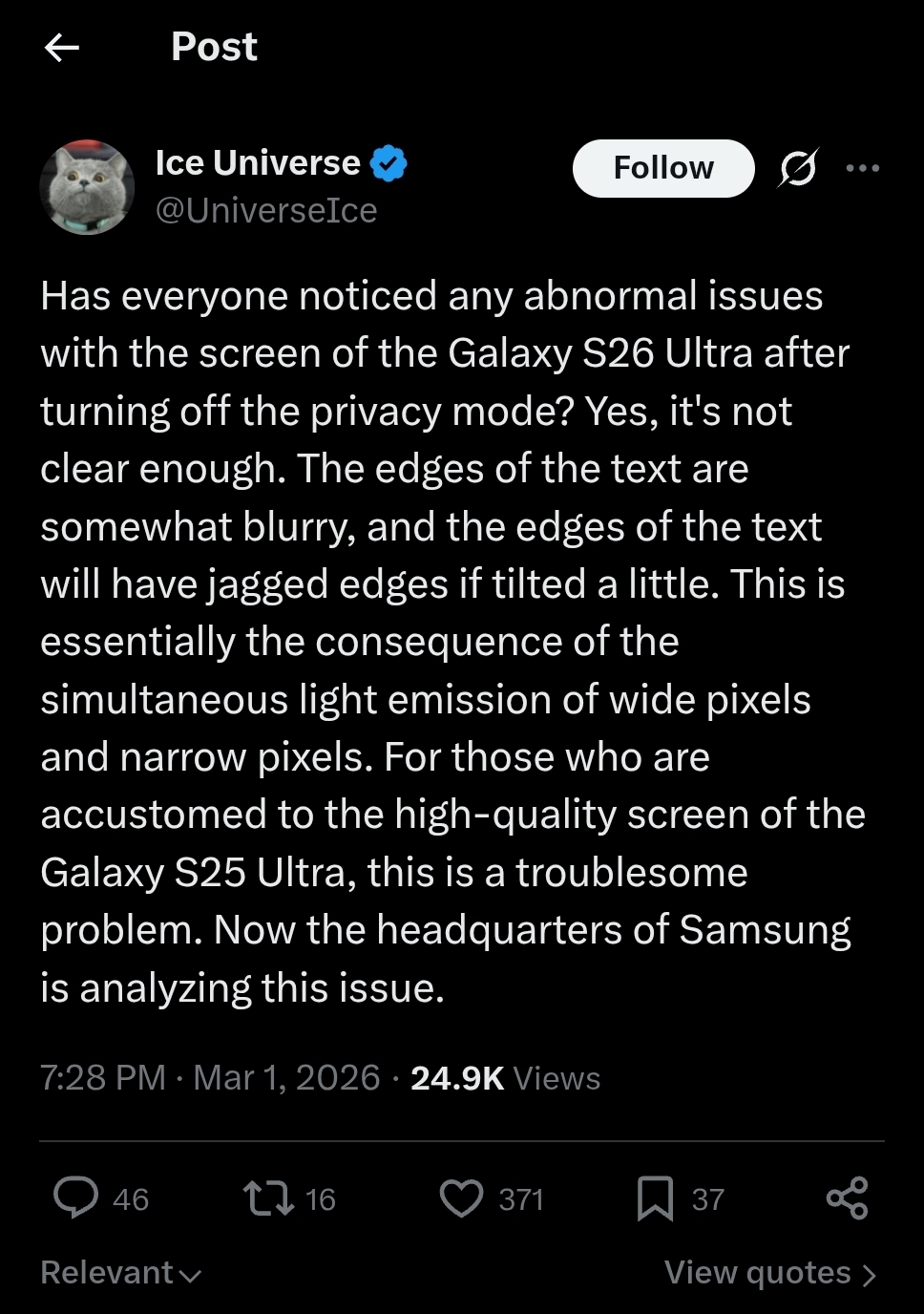 갤s25울트라랑 s26울트라랑 비교해봤는데 프라이버시 보호 기능이 필요없으면 갤s25울트라 디스플레이 품질이 월등히 좋습니다. | 26.03.02 00:12 | | |