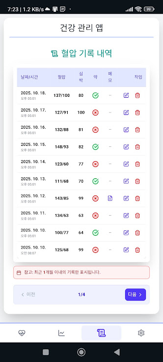 매일 기록된 수치를 바탕으로 하루 평균 혈압을 자동 계산해 주며,