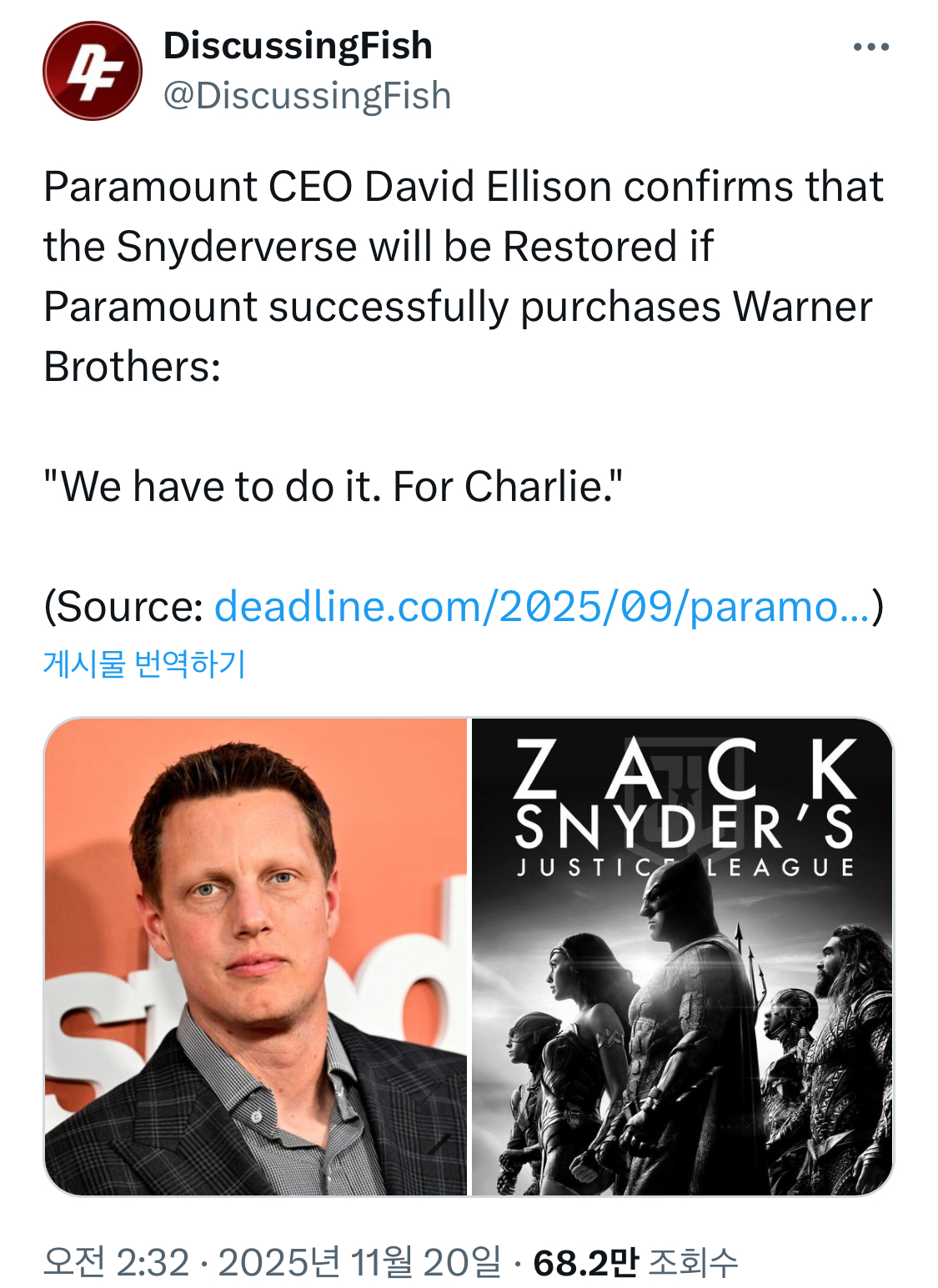 트위터 낚시 계정이 “파라마운트 ceo가 스나이더버스 복구를 원한다” 라고 낚시질을 했는데 아무래도 이거에 속은 사람들이 있는 것 같음