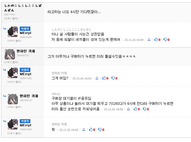 보통은 5분내지 10분 전에 대기열 생기는데 갑자기 3시에 재고 상품 투하해서 대기열이 일찍 생겨버림 | 25.11.26 16:22 | | |