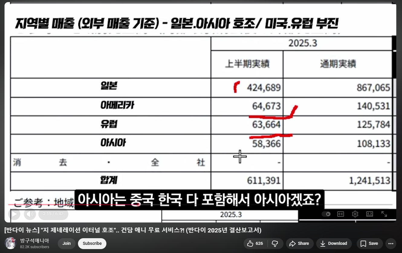 건프라 2025년 상반기 매출 자료이며 출처는 방구석 매니아 유투브인데 일본 & 아시아는 잡은 물고기이고 부진이라고 하나 아메리카 유럽 매출이 아시아를 뛰어 넘어 이쪽으로 집중하자로 정한 것 같네요 생각보다 중국이 매출이 적은가보네요 대륙 한정판 잘 찍어줘서 중국이 매출이 좋을 줄 알았는데... 실상 물건들은 아메리카 유럽으로 가는 건가요?