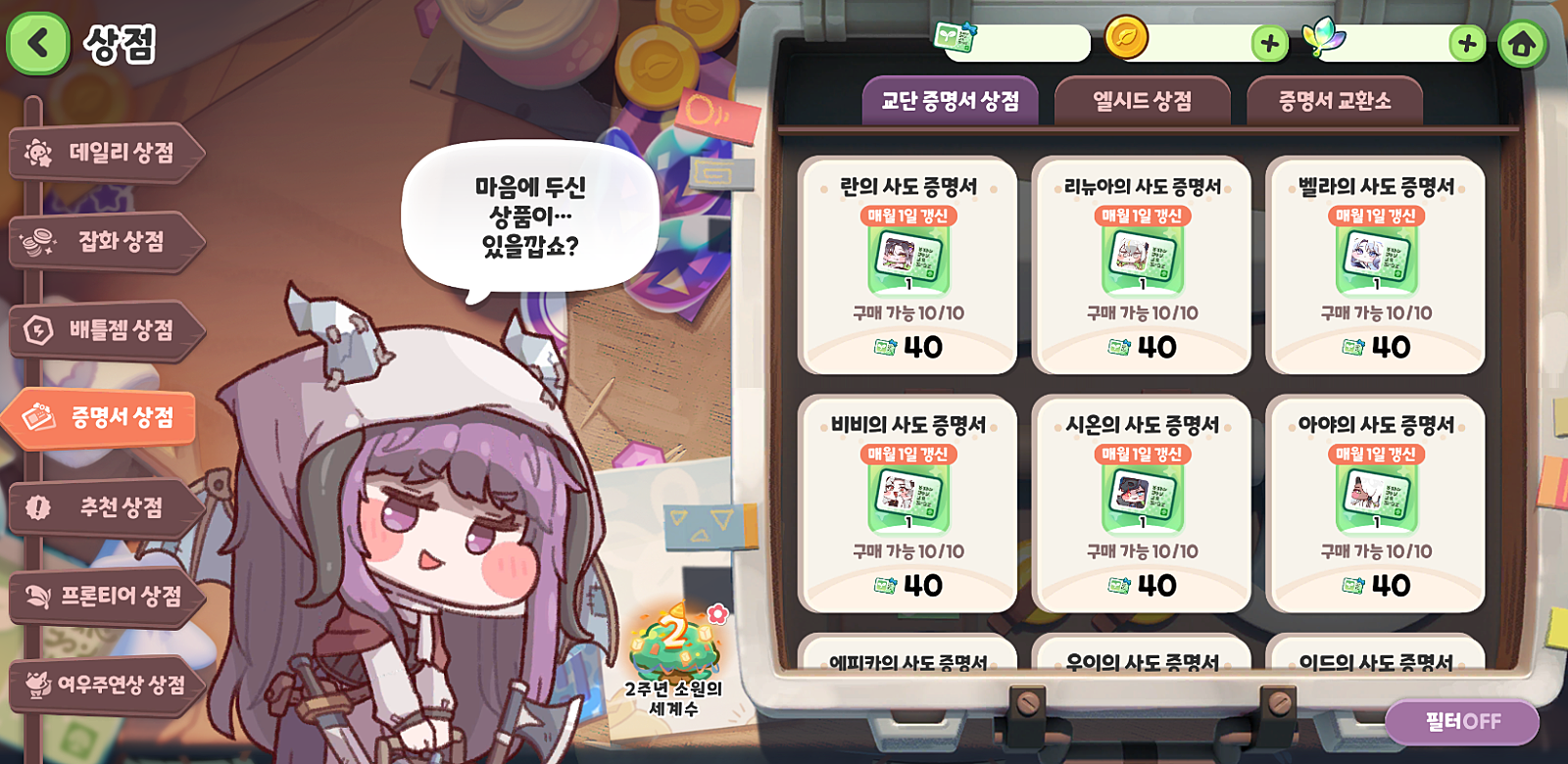 - 매월 1일 갱신되며, 1회 당 40개의 교단 증명서로 엘다인 사도 증명서를 월 최대 10회까지 구매 가능합니다.