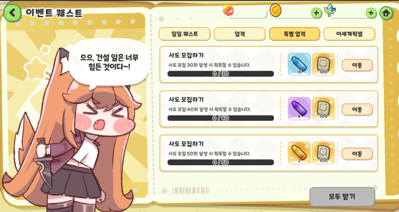 이벤트 스테이지 클리어 보상 및 업적 보상으로 이벤트 재화를 획득하실 수 있으며