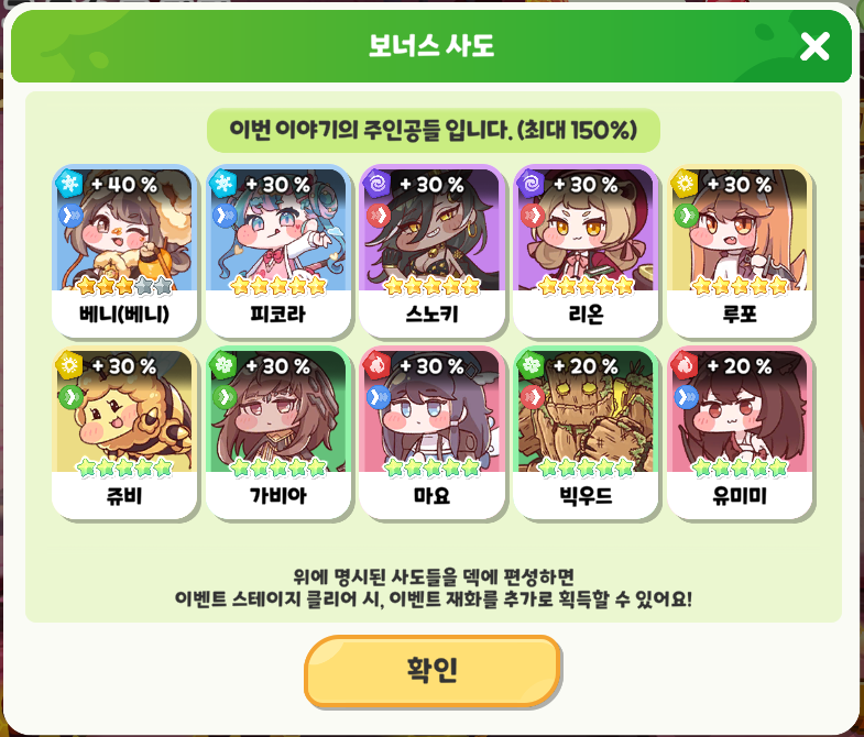 면제 보너스 비율의 경우 보너스 사도 편성 변경 후에 스테이지를 재클리어 시 변경됩니다.
