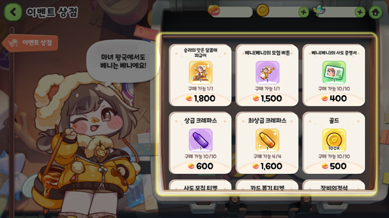 획득한 이벤트 재화를 사용하여 다양한 아이템과 움직이는 베니(베니) 피규어를 교환할 수 있습니다.