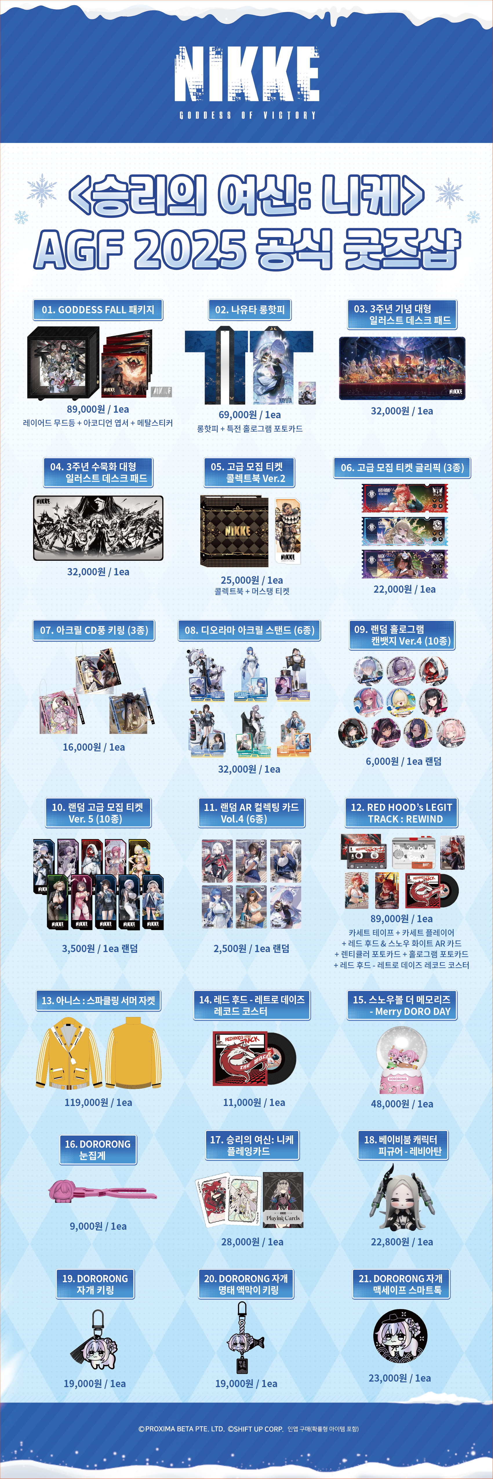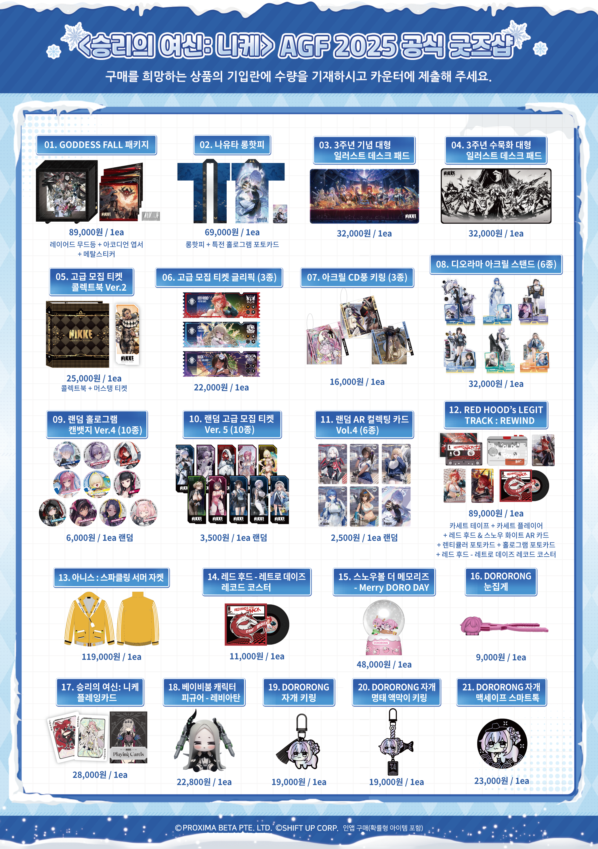 - AGF 2025 <승리의 여신: 니케> 부스에서 굿즈샵이 운영됩니다. 굿즈 구매를 희망하시는 지휘관님께서는 니케 굿즈샵에서 다양한 굿즈를 구경하고 구매하실 수 있습니다.