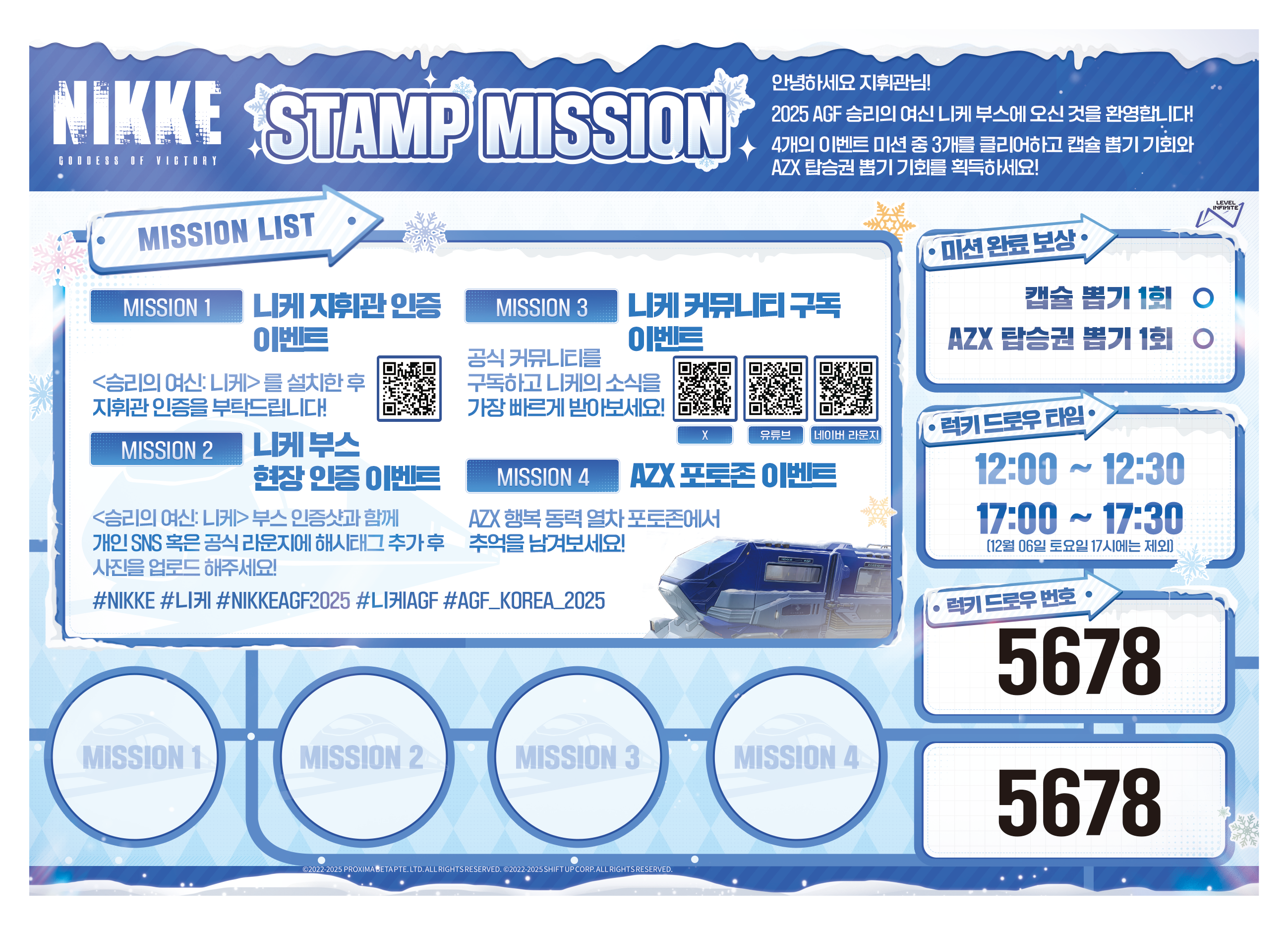 - AGF 2025 <승리의 여신: 니케> 부스에 등장한 AZX 열차 사진을 촬영하고 스탬프를 획득하세요!