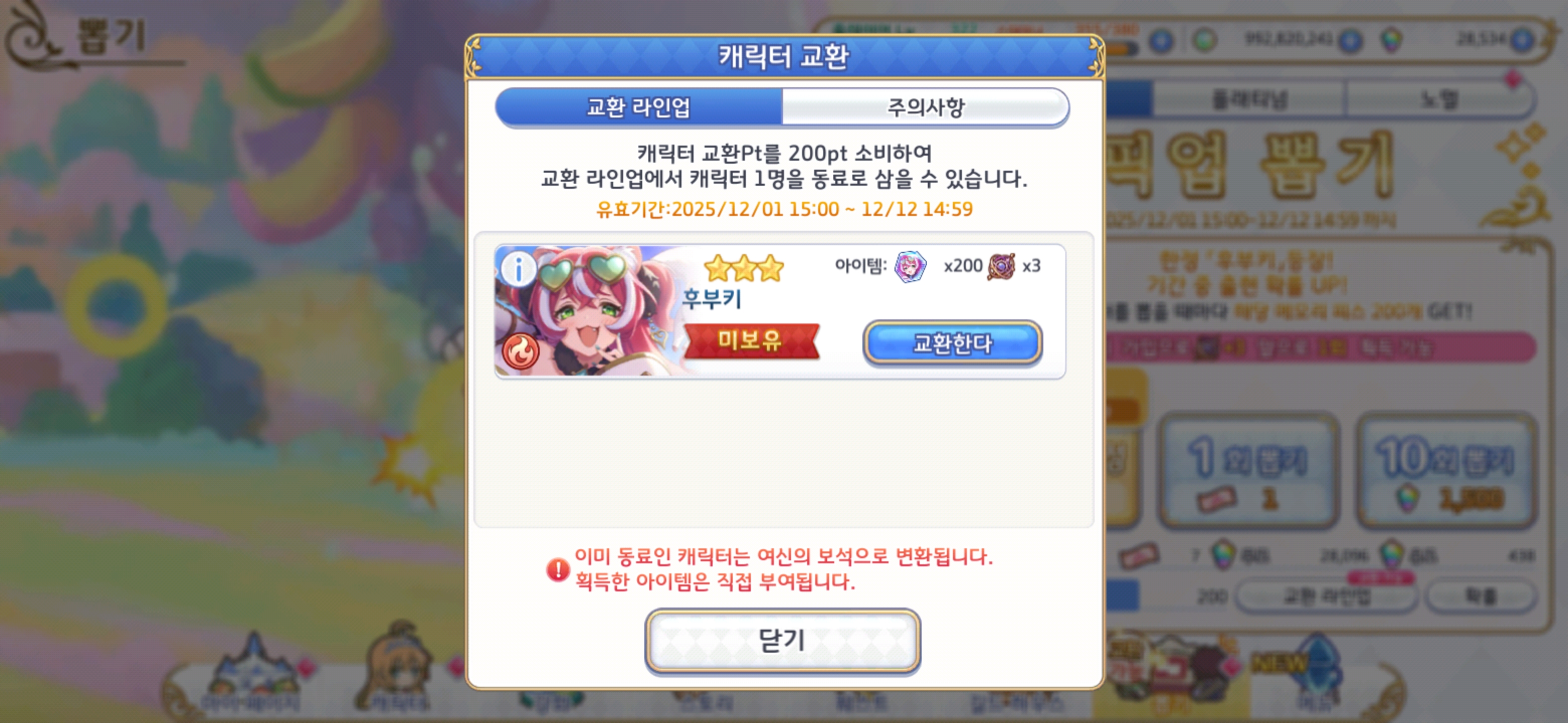 픽업 뽑기 기간 동안 획득한 캐릭터 교환 Pt를 「후부키」 로 교환할 수 있습니다.