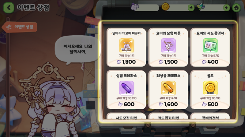 획득한 이벤트 재화를 사용하여 다양한 아이템과 움직이는 요미 피규어를 교환할 수 있습니다.
