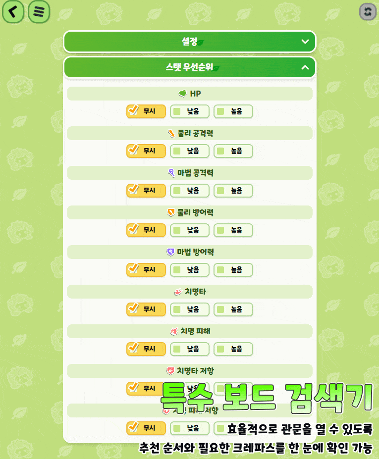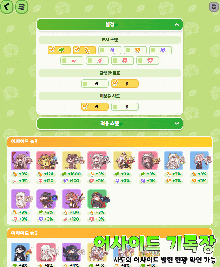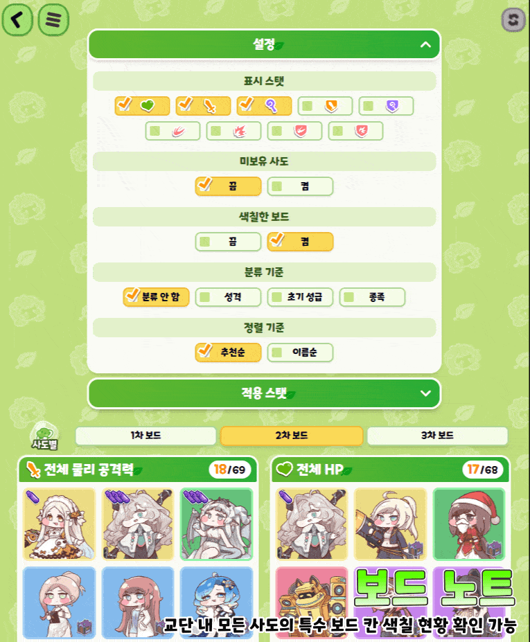 설정 기능을 이용해 사도/능력치별 보드 색칠 현황도 확인할 수 있습니다.