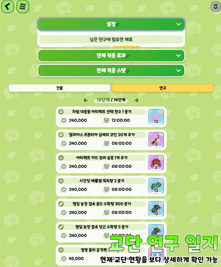 시설 레벨업에 필요한 재료와 연구 현황