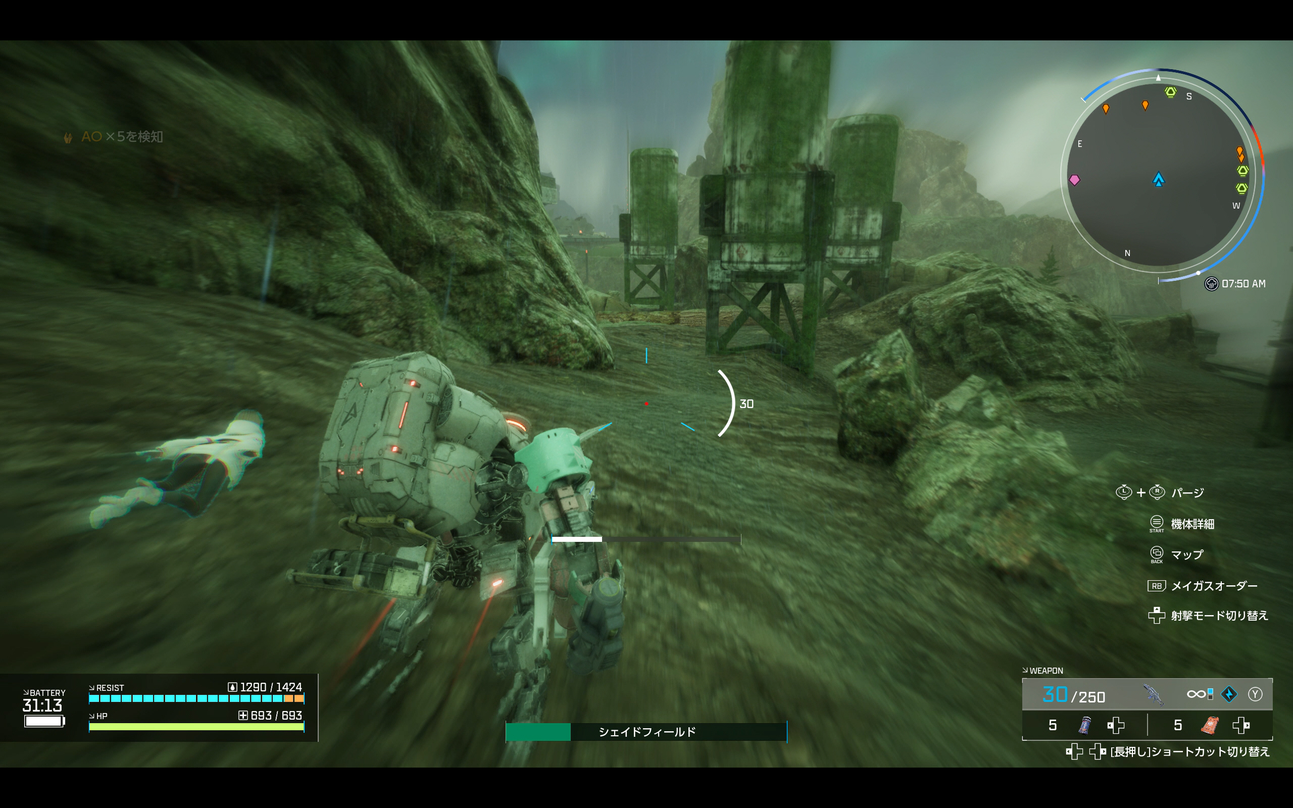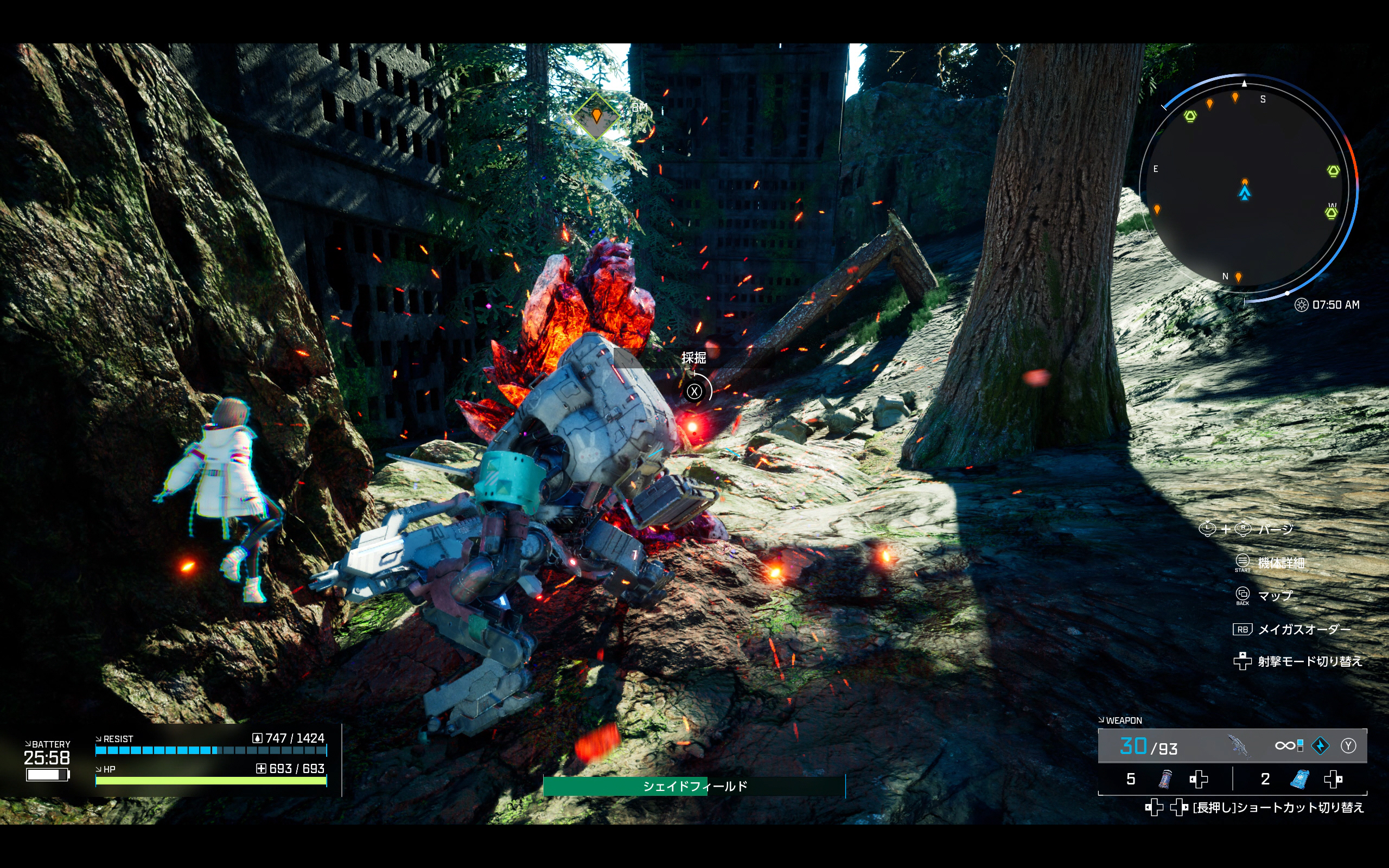 이번 시연에서 미션은 AO 결정 채굴만 가능하다. 그래서 메이거스 오더로 AO 서치를 해보면 레이더처럼 생긴 미니 맵에 AO 결정이 있는 장소의 방향이 표시된다. AO 결정은 먼저 채굴을 한 뒤에 X 버튼을 눌러 주워야 하며, 이는 다른 아이템들도 대동소이하다.