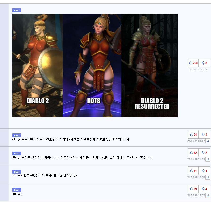 그리고 취합된 질문을 확인한 디아블로 II: 레저렉션의 총괄 디자이너를 담당하고 있는 ‘롭 갈레라니’가 답변을 전달했다. 루리웹 유저들의 질문에 답한 구체적인 내용은 아래에서 확인할 수 있다.