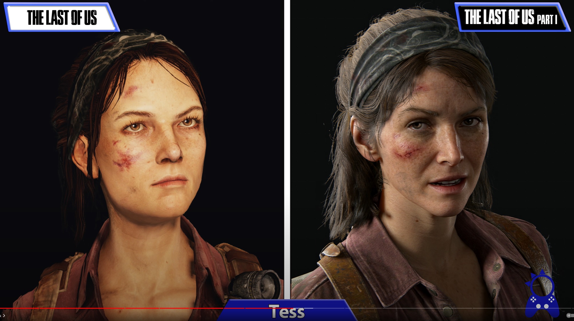 다만 몇몇 주요 인물 모델링은 아쉬운 부분이 있습니다. 전반적인 인물 모델링이 홍채, 주근깨, 주름 등 여러 디테일한 부분들이 좀더 강조되거나 추가되고 표정 애니메이션도 다양하면서 자연스러워져 좀더 실사에 가깝게 변했다는 점은 분명 나쁘게 바라볼 요소는 아닙니다. 하지만, 오히려 단순하게 표현되었던 얼굴 텍스쳐로 인해 캐릭터가 좀더 미형으로 느껴졌던 기존과는 다르게 현재의 파트 1 캐릭터들은 우리의 가슴 속에 품고 있던 이미지와 사뭇 달라졌다는 점에서 다소의 아쉬움이 새어나옵니다. 단적으로, 엘리는 여전히 귀엽지만 덜 귀여워 보이고, 앳되었던 느낌보단 좀더 성숙해보입니다. 테스는 좀더 늙어보이구요.