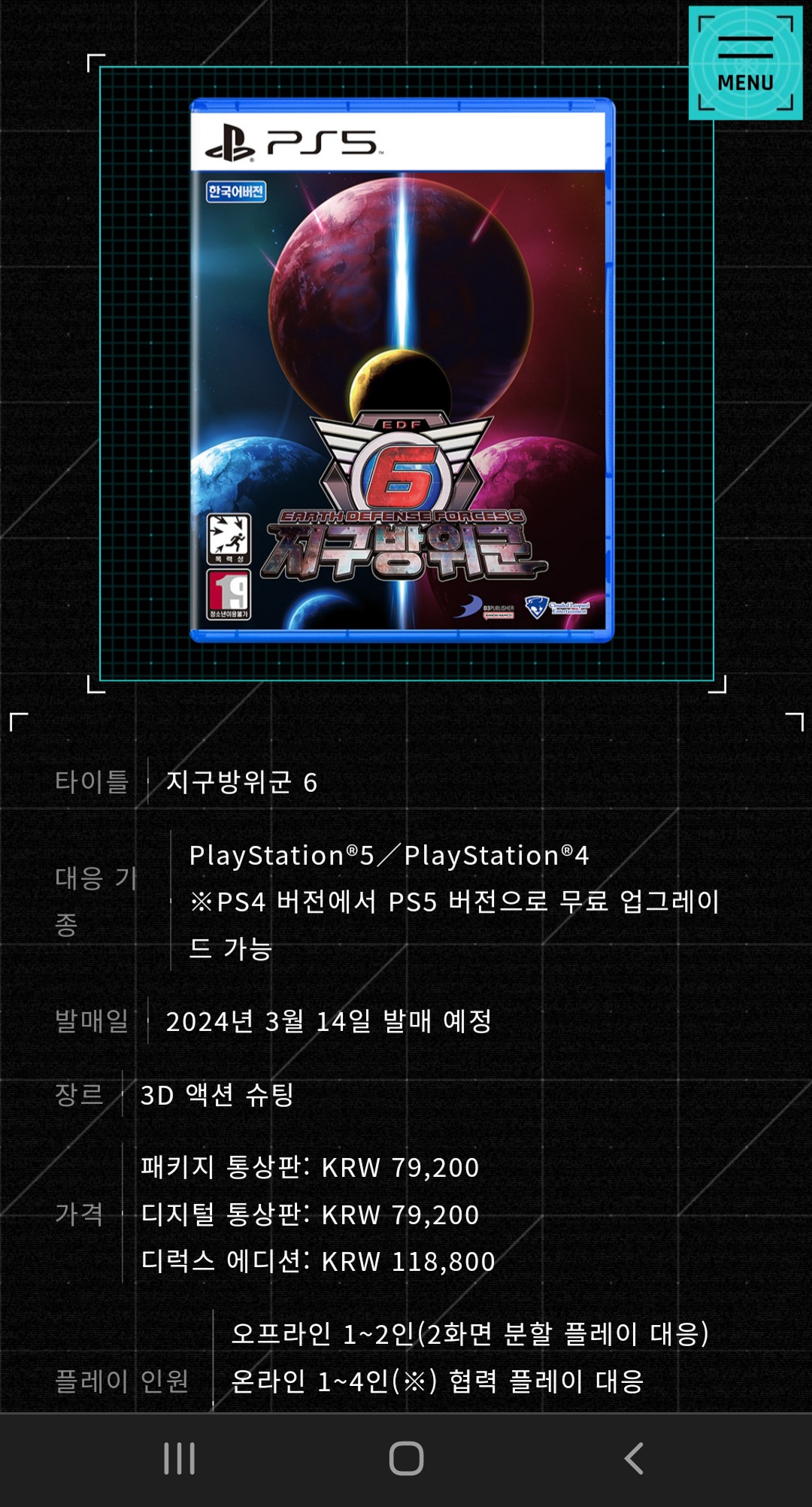 2024년 3월 14일 정식 발매되는 PlayStation®5 『지구방위군 6』 패키지 제품은 온라인 쇼핑몰 소프라노(http://www.sofrano.com/)를 포함한 다양한 온/오프라인 마켓에서 구입할 수 있으며, 심의 등급은 청소년이용불가다. 게임에 관한 자세한 소식은 게임에 관한 자세한 소식은 게임 공식 홈페이지(https://www.cloudedleopardent.com/game/edf6/kr/) 및 게임피아㈜ 블로그(https://blog.naver.com/gamepia-official), 페이스북(http://facebook.com/egamepia), 인스타그램(https://www.instagram.com/gamepia_official/)에서도 확인할 수 있다.