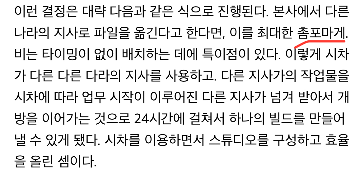 이런 결정은 대략 다음과 같은 식으로 진행된다. 본사에서 다른 나라의 지사로 파일을 옮긴다고 한다면, 이를 최대한 촘포마게. 비는 타이밍이 없이 배치하는 데에 특이점이 있다. 이렇게 시차가 다른 다른 다라의 지사를 사용하고. 다른 지사가의 작업물을 시차에 따라 업무 시작이 이루어진 다른 지사가 넘겨 받아서 개방을 이어가는 것으로 24시간에 걸쳐서 하나의 빌드를 만들어 낼 수 있게 됐다. 시차를 이용하면서 스튜디오를 구성하고 효율을 올린 셈이다.