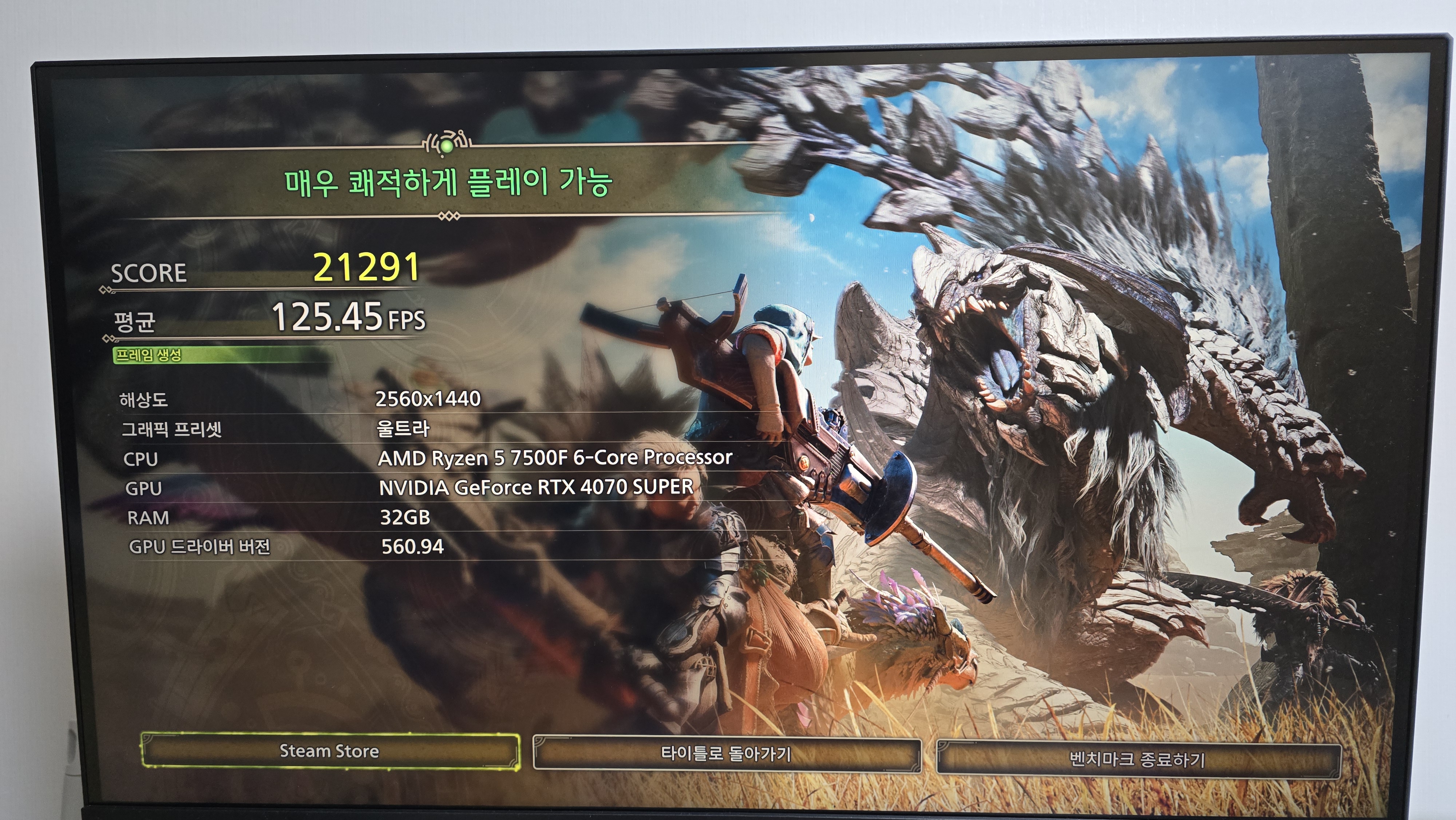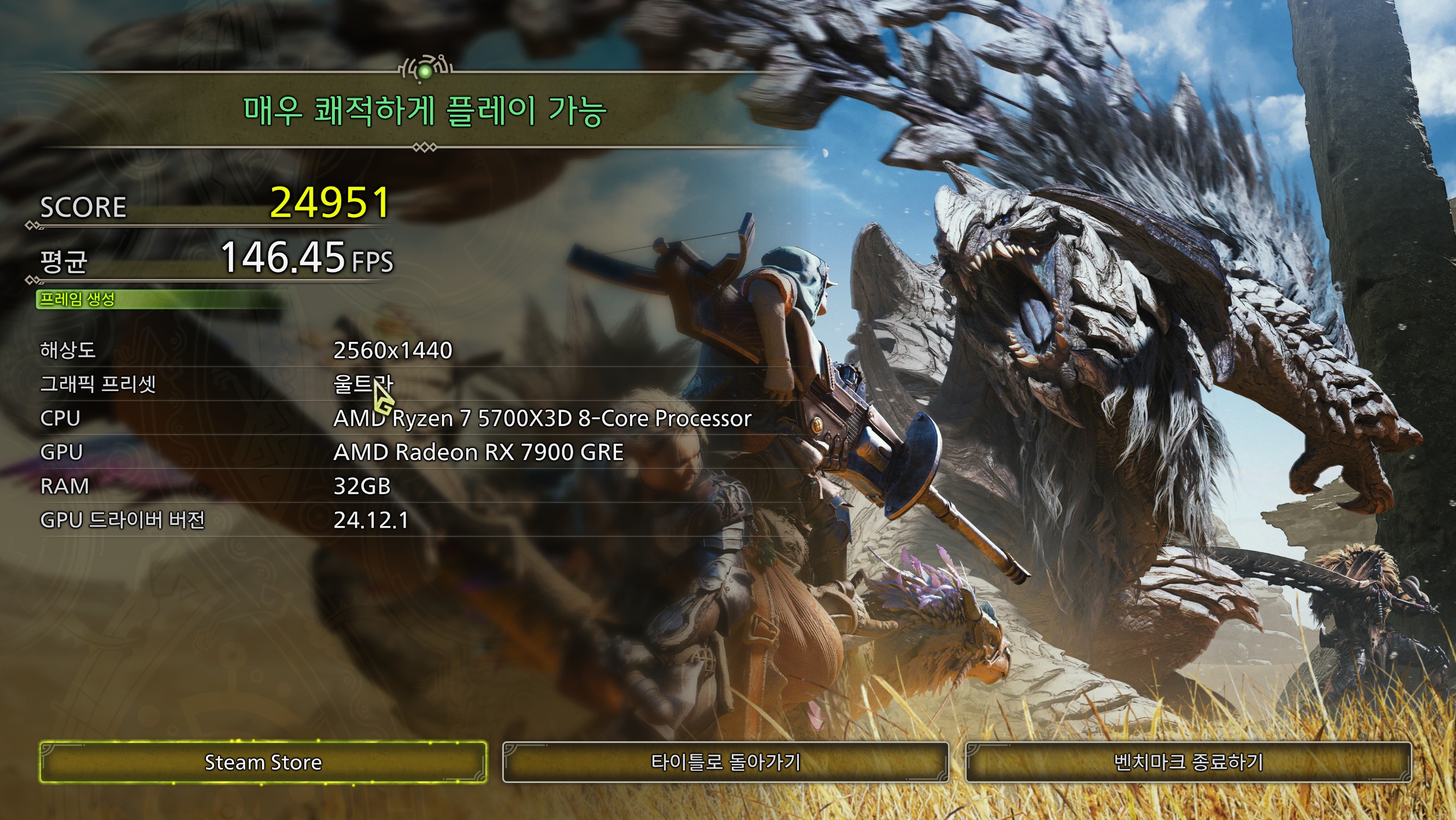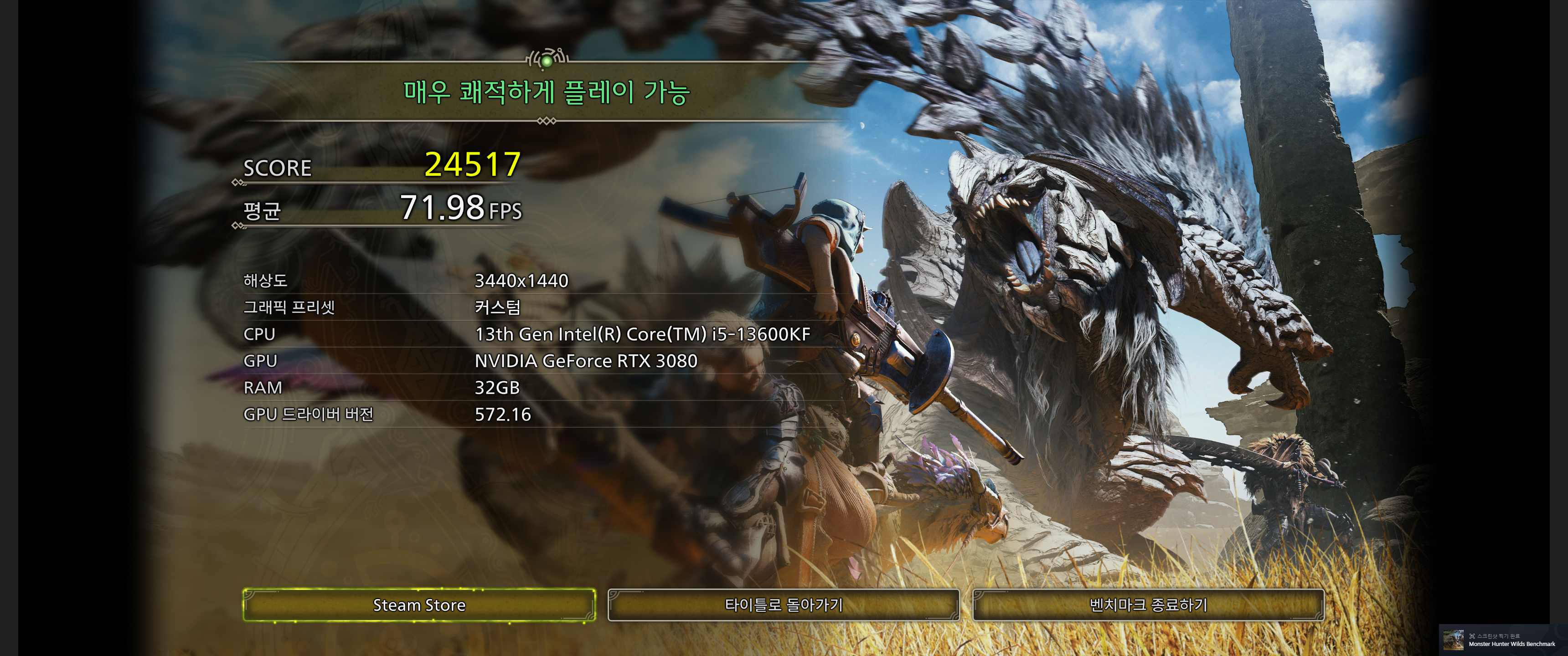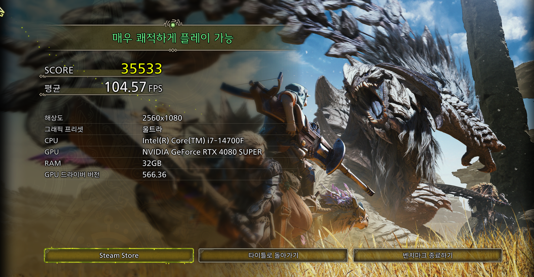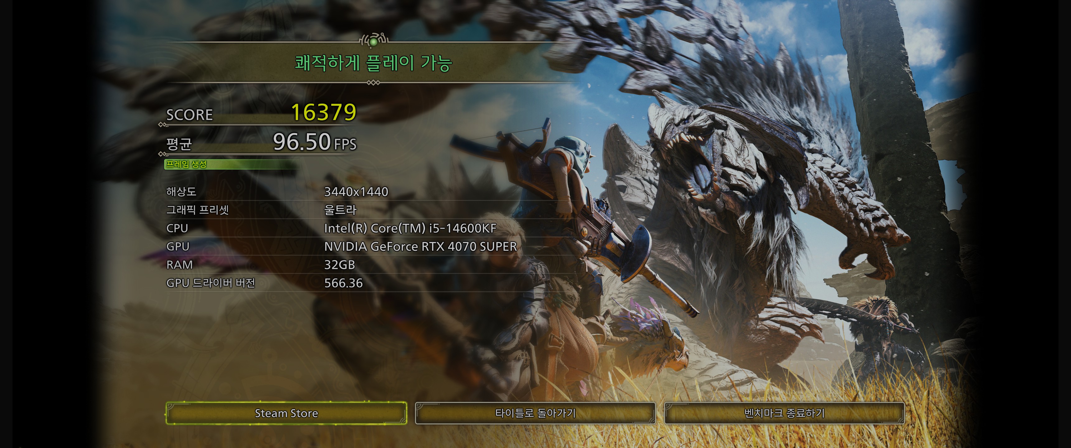 스팀 상품 정보 페이지 에서 다운로드 가능한 '몬스터헌터 와일즈 벤치마크'에서는 몬스터헌터 와일즈의 데모 플레이를 감상하면서 자신의 PC 성능을 측정할 수 있다.