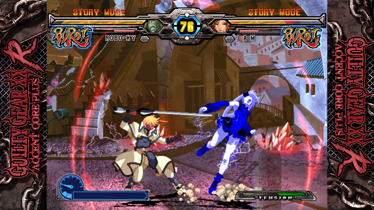 궁극의 게임 밸런스 – 조작성이나 기본 시스템은 전작을 베이스로, 특정 공격 버튼을 차례로 누르는 것으로 간단하게 연속기를 계속해서 낼 수 있는 ‘개틀링 콤보’나, 히트시에 상대를 공중 높이 띄워 올리는 중단 기술 ‘더스트 어택’, 발생 중인 액션을 강제적으로 중단시킨 후 빠르게 다음 액션을 발동하는 시스템 ‘로망 캔슬’ 등, 길티기어 시리즈 다운 부분은 유지하면서 밸런스를 조정!