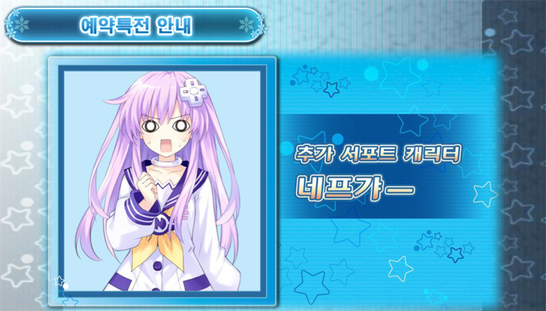 또한, 예약 판매를 통해 구매하는 고객분께는 선착순으로 게임 본편에서 사용할 수 있는 유용한서포터인 「네프갸―」를 사용할 수 있는 프로모션 코드를 증정한다.
