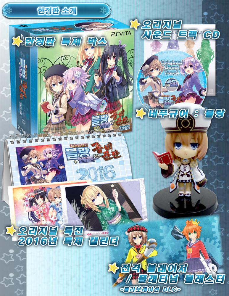 여기에, 한국판 오리지널 특전으로서 신규 일러스트 및 다양한 이미지로 꾸며진 ‘격차원태그 블랑+넵튠 VS 좀비 군단 2016년 특제 캘린더’를 함께 증정한다.
