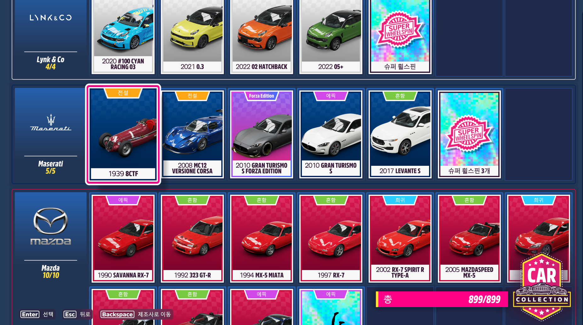 제가 말씀드린 마세라티 1939 8CTF 차량은 경매장에서 확인해보니 매물이 안나오는지 여전히 올라온게 없네요. 초창기때 시즌보상으로 주는 차인데 언제 다시 풀릴지는 모르겠네요. 직접구하시려면 수시로 경매장 들어가서 매물이 있는지 확인해 보셔야 합니다.
