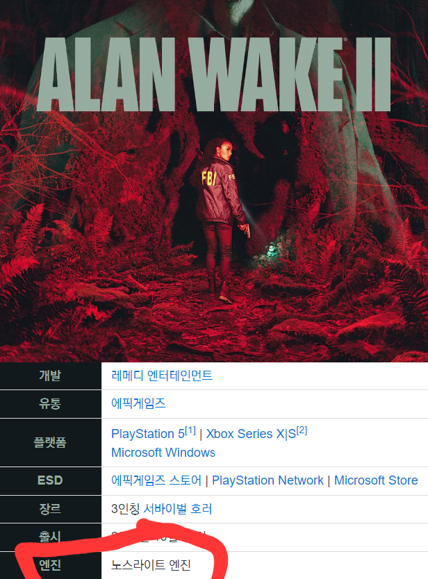 죄송한데 아닌데요 자체 개발엔진인 노스라이트 엔진입니다 레메디 공홈 https://www.remedygames.com/northlight Northlight powers games such as Quantum Break, CrossfireX (Story Mode), the multi-award-winning Control, the upcoming [[[[[Alan Wake 2]]]], and the next Control games. 앨런웨이크2 유통인 에픽 공홈 https://www.epicgames.com/help/ko/alan-wake-2-c19685014487835/c19685053033499/alan-wake-2-a19860777059227 Alan Wake 2는 Remedy의 Northlight 엔진을 사용합니다. | 23.11.03 09:17 | |