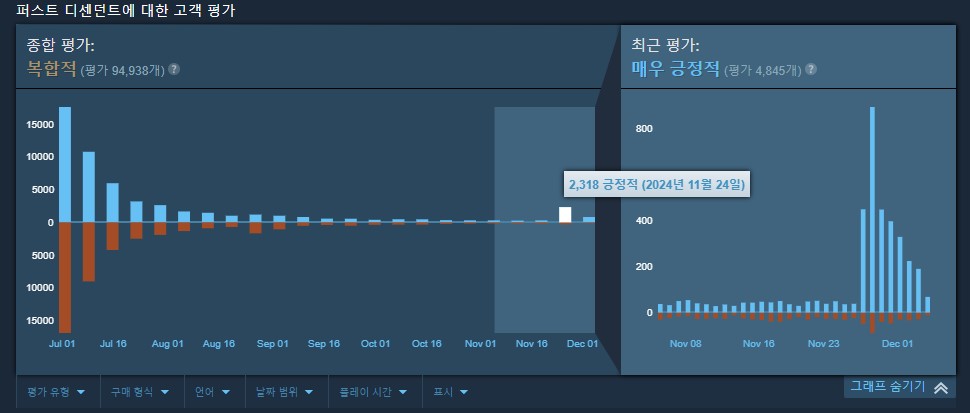 저도 이 의견에 동의 합니다. 시기상 딱히 인게임에서 큰변화가 없었고, 발전 가능성에 대한 시즌2정보가 많이 나왔을 뿐인데 특정 구간에서 천장 찍인 지표를 포함해서 평균값으로 보기에는 무리죠. 발전을 했다고 평가하려면 적어도 게임내 큰 변화 이후 적어도 기간을 1달 정도는 봐야 하지 않을 까요? | 24.12.05 06:55 | | |