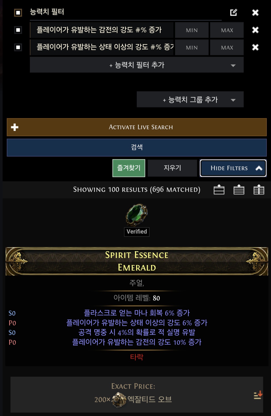 모바일로 능력치 필터만 저렇게 넣어도 잘 나오네요. 200엑잘부터 시작입니다.