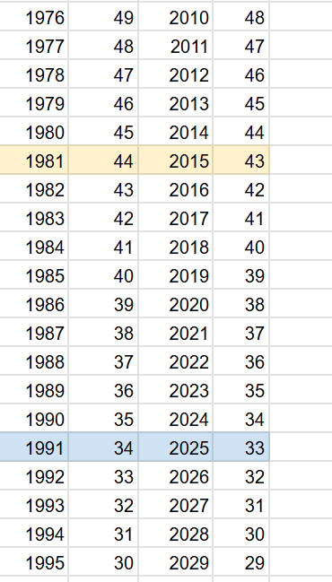 아무리 생각해도 이해가 안되서 편하게 표로 만들어봄. 연도는 게임내 33쓴 게 2025년도라고 임의로 설정함. 즉, 현재 2025년도에 33으로 바꿔써서 34살이 다 죽은건데.. 이 34살들은 1991년생임.(게임이 서양게임이니까 당연히 만나이로 계산) 그게 파란색으로 칠한 부분 내용이고, 그렇게 숫자를 쭉 거슬러 올라가서 10년전 내용을 봅시다. 10년전에 43을 쓰고 44살이 다 죽어야 되는데... 1981년생이 44살인 해는 올해지 2015년도에는 똑같이 34살이었음. 이건 90원정대도 마찬가지임...