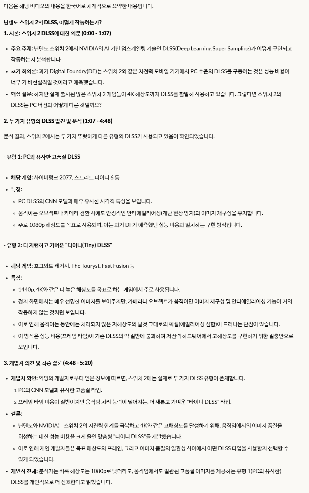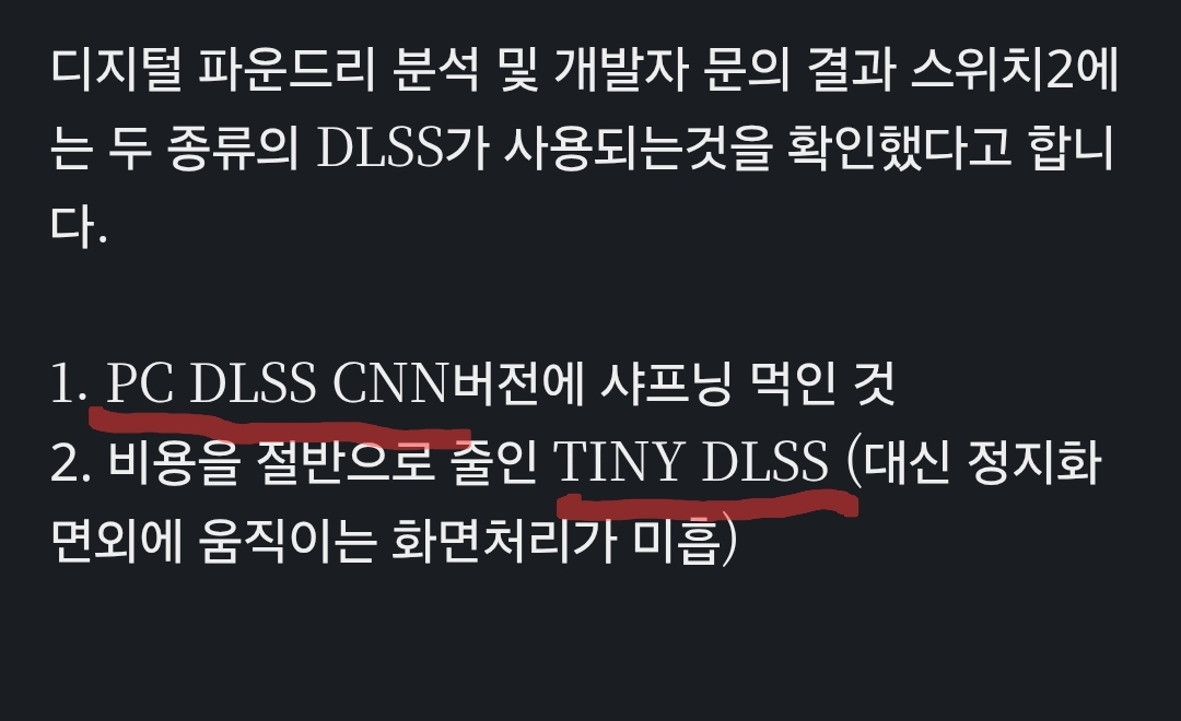 순서가 다른거 아님? 글쓴이는 스위치2성능이 생각보다 낮아서 dlss구현이 힘들거라 생각했는데 dlss이 사용되고 있어서 알아보니 두가지 타입의 DLSS를 사용하고있었고 그중 하나가 TINY DLSS를 병행 사용해서 코스트를 줄여 사용하는 것으로 보인다는게 글의 순서잖아요 | 25.10.05 15:45 | | |