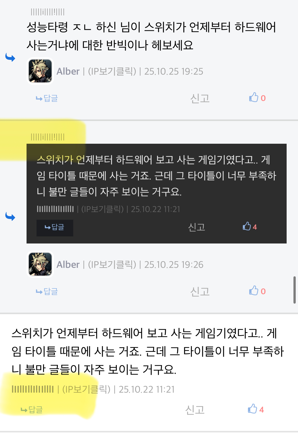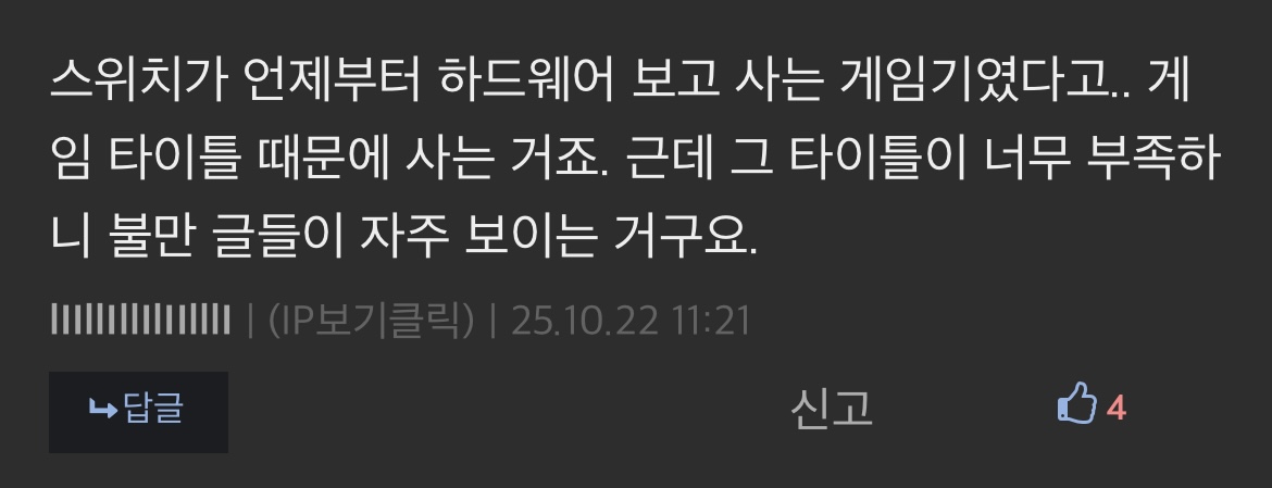 성능타령 ㅈㄴ 하신 님이 스위치가 언제부터 하드웨어 사는거냐에 대한 반빅이나 헤보세요 | 25.10.25 19:25 | |