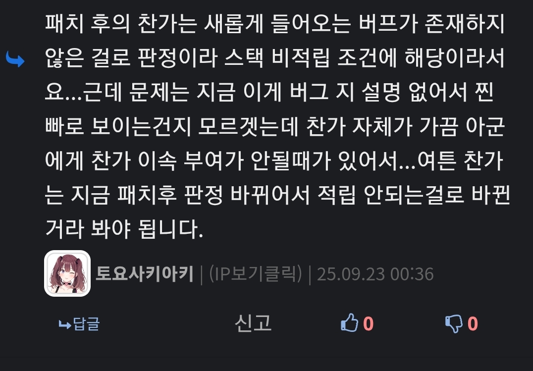 여튼 찬가 판정이 바뀌어서 찬가는 후원가 스택 쌓기 조건 비해당으로 바뀐걸로 압니다... | 25.09.23 00:39 | | |