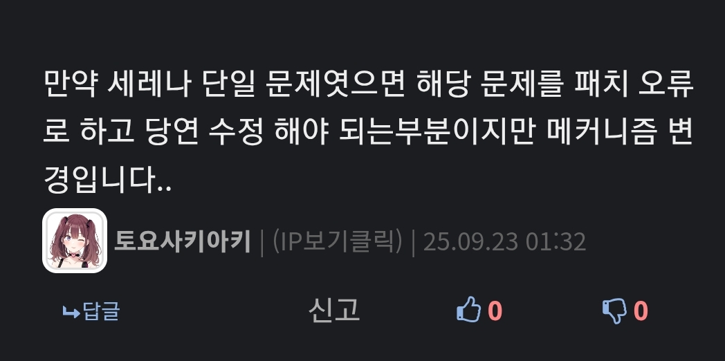 그...하...음.. 패치 노트 내역을 근거로한, 토론인가 싶었는데...아쉽네요... 다음부터는 오해의 소지가 없도록, 처음부터 뇌피셜이라고 해주세요. 패치노트 내역을 근거로 했을 때, 현 세레나의 상황은 버그로 보는게 맞겠군요. | 25.09.23 02:17 | | |