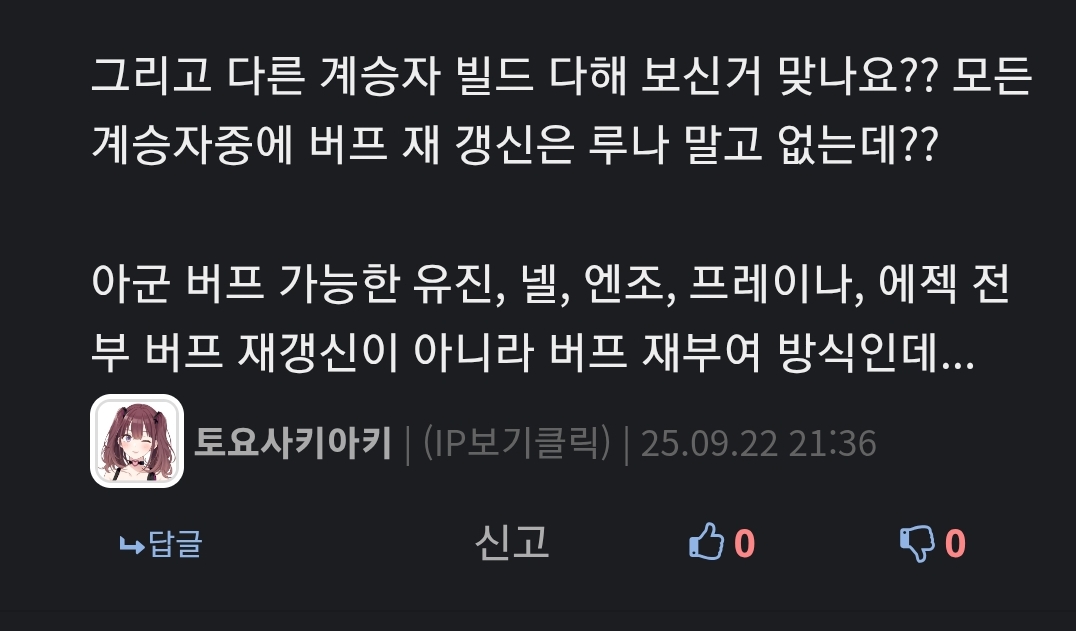 네 그쵸 스킬 마다 버프 방식이, 다른 것들이 있죠. 그래서 열혈 에잭, 루나, 유진의 총기빌드는, 있었으나 총기딜러 대명사 였던 엔조는, 열혈을 이용한 총기빌드가 없는 이유죠. 님아...버그는 버그여요... 세레나는 잘만 되던게 안되죠? 그럼 버그인거예요. 일단 뭐든 공식에서 말이 없으면 버그인겁니다. 세레나 얘기에, 루나는 일단 구석에 있으라고 해요. 지금 세레나 얘기이고 루나 보다 더, 중요한 얘기니까 루나얘기 금지요. | 25.09.23 02:41 | | |