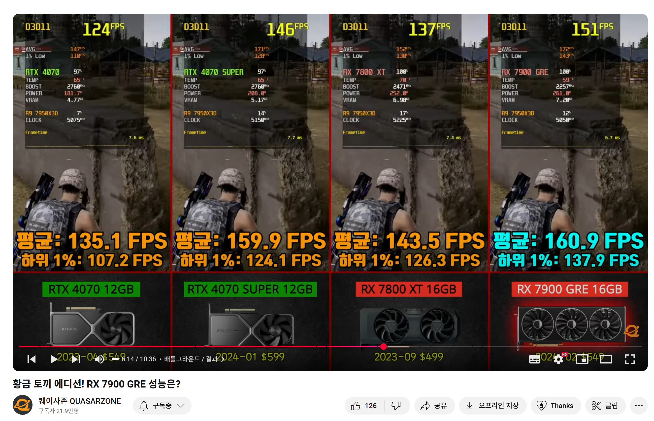 라데온의 경우 vram 효율이 떨어지므로 vram보고 그래픽카드를 고를땐 주의하셔야합니다. 비램이 중요한 각종 작업에선 7900xtx가 비램 24g가지고도 4060ti 8g보다 느린 작업들이 있을정도고 동일 게임을해도 비램사용량이 더 높아 비램용량차이가 줄어듭니다 https://youtu.be/WpniMTIApNI