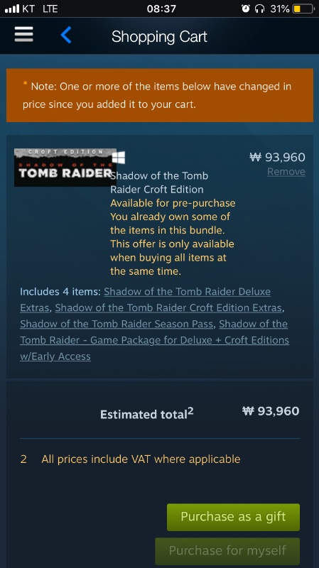 좀더 확인해보니 현재 스팀 상점 오류로 모든 에디션이 본편만 구매되는 상황입니다. 꾸러미 내용물 안사지고 본편만 할인액 -19% / -3% 적용되고 있습니다. (영수증에 크로프트 에디션/얼리엑세스 이거 디지털 디럭스도 찍히고 있습니다. 안심할 내용은 아님.) 스팀에서 이후 재지급 해줄 확률이 높긴 하지만 그래도 어느정도 도박성 있는 딜이니 다들 확인하시고 구매하시길... | 18.08.21 15:00 | | |