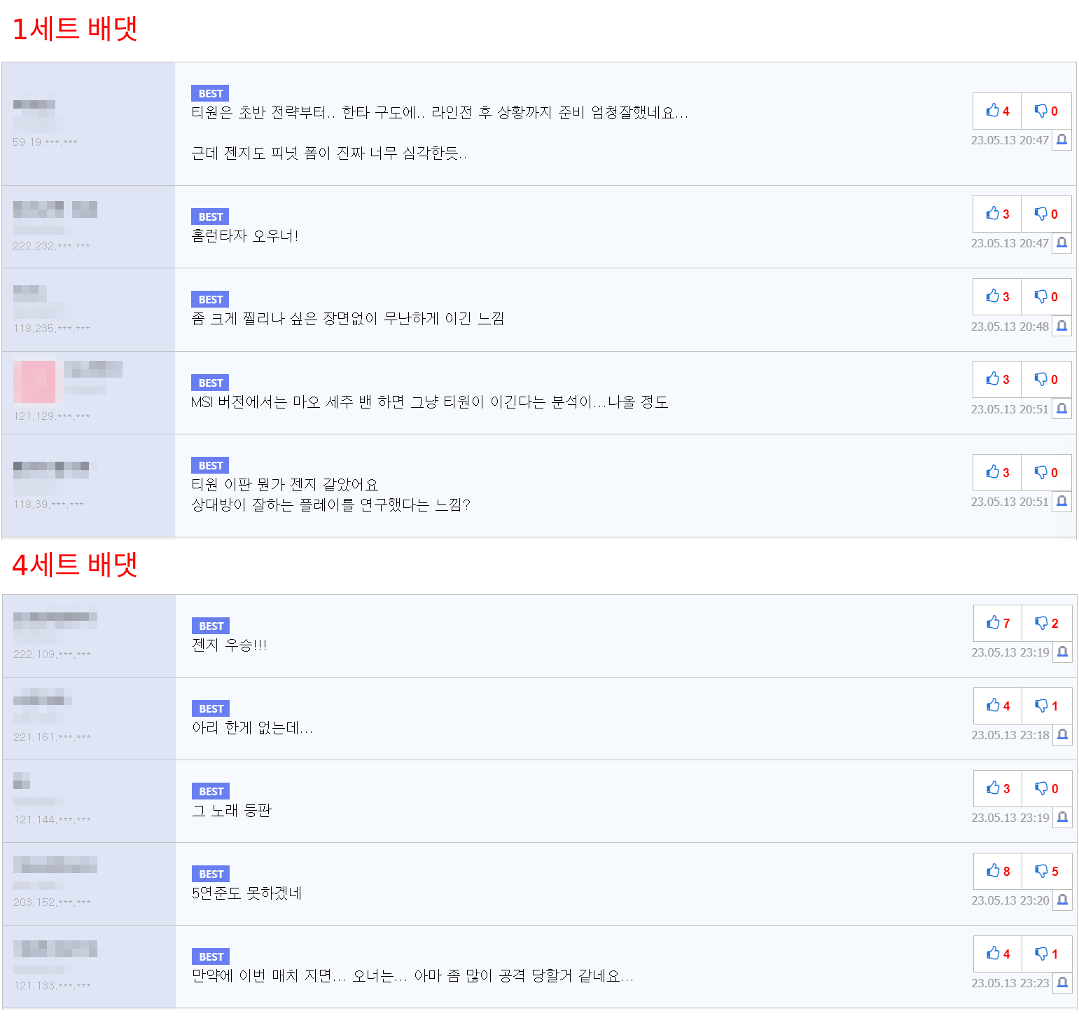 1세트 4세트 배댓임 (2세트는 배댓이 없고 3세트는 경기가 끝난후라 배댓이 격추됨) 각자 판단하시길 | 23.05.14 00:25 | | |