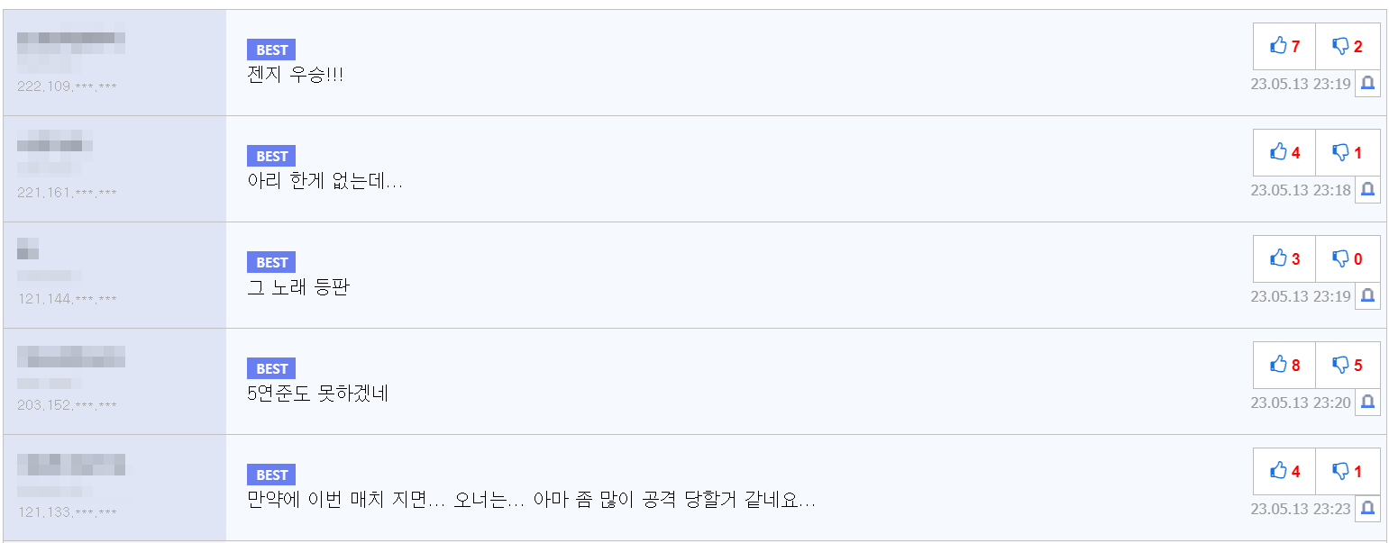 ㅂㅅ들 욕하는데 애먼 선수들 끌어들이지는 맙시다. 애초에 조롱하던 애들은 젠지 승패에 관심도 없는 것들일테고 | 23.05.14 02:09 | | |