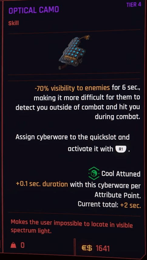 - 이제 사이버웨어를 특전 중 하나에 "조율"하여 해당 특전에 투자한 경우 더 효율적으로 만들 수 있습니다. (예: 아래 스샷의 광학 카모는 "냉정" 특전에 맞춰져 있습니다)