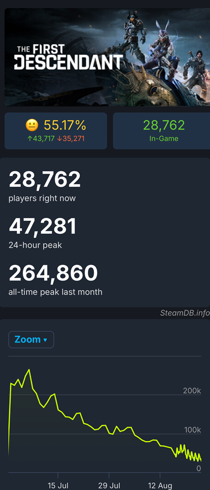 워프레임 최대동접 6만인데 이건 벌써 4.8만 떨어지는 속도가 광속이네 비슷한 시기 원스휴먼은 아직13만인데