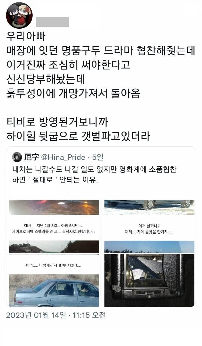 저런 협찬으로 제공해 준 소품들은 전문가들이 붙어 최대한 피해없이 촬영 후 행여나 파손이 되면 보험으러 보상이라도 보장이 되야하는데..? 정 박살이 불가피한 씬이라면 아예 구입을 하던가 아니면 레플리카라도 써야지 저걸 저대로 반납했다고??