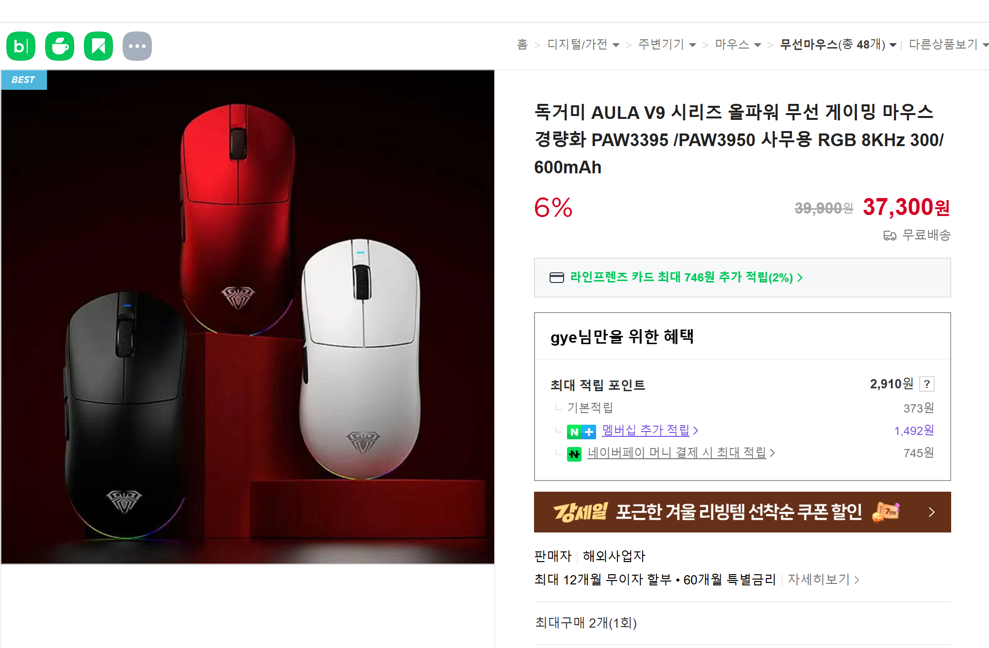 독거미나 vxr 중에 3950칩+내장배터리 큰 것으로 구매하시는 걸 추천합니다. 8k 폴링레이트 되는게 37000원돈이라는 것도 말이 안되긴한데... 성능 내구성 다 좋습니다. 대신 8k는 컴 성능과 리소스 엄청 잡아 먹으니 4k까지로 사용하는 걸 추천합니다.