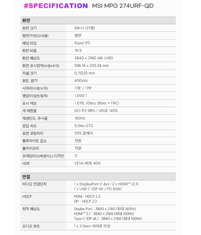 개인적으로 콘솔게임을 좋아해서 현 세대 콘솔(ps5, xboxsx) 을 보유하고 있는데 집에 보유 중인 디스플레이는 FHD뿐이라(공간문제 기타 문제로 4KTV는 구매가 어려움) 언제나 4k를 느껴보나 했는데 마침 모니터도 슬슬 맛이 가고 있고 노안도 겹쳐서 좀 더 큰 모니터를 찾고 있던 중에 MSI MPG 274URF-QD를 눈여겨 보고 있었습니다.