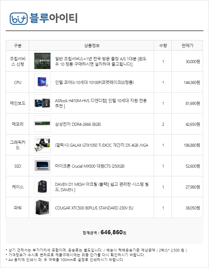 추천 견적 링크 : http://blueit.co.kr/shop/estimate_copy_blueit.php?oldesessionid=6125584236-2094427657 ★ 조립PC 전문 쇼핑몰 블루아이티 입니다. ★ 안녕하세요. 찡찡이정인 님. 65만원 이하의 피파온라인4 정상 구동 가능한 PC 견적 구성해 보았습니다. 해당 견적이라면 FHD 해상도 기준 피파온라인4 환경에서 준수한 퍼포먼스 보여줄 것으로 예상됩니다. 댓글에 첨부된 이미지 및 링크 참고하시기 바랍니다. 더 자세한 상담은 카카오톡 채널(플러스친구)로 문의하시면 답변 받으실 수 있으니 많은 이용 부탁드립니다. 이용해 주셔서 감사합니다. =========================================== 회원가입 후 결제 시, 마일리지 적립!(카드, 현금 모두 해당) =========================================== 카카오톡 채널(플러스친구-☆실시간 상담 가능☆) : https://pf.kakao.com/_rXkqj 대표번호 : 전국 어디서나 1670-7837 이메일접수 : blueit@blueit.co.kr 유튜브 채널 (BLUEIT) : https://♥♥♥cjxs 블루아이티 카페 : https://cafe.naver.com/blueitpc 구매후기 : https://cafe.naver.com/blueitpc/menu/59 조립갤러리 : https://cafe.naver.com/blueitpc/menu/61 * 매장운영시간 * 평일은 9:00~17:00 토요일, 일요일, 법정 공휴일은 휴무입니다.