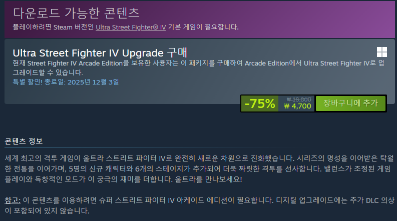 그러네요. 상점을 가도 'Ultra Street Fighter® IV 제품은 이미 Steam 라이브러리에 있습니다.' 라고 나와서 울트라인줄 알았는데 게임 들어가면 슈퍼로 시작하네요. 슈퍼가 스팀에서 없어지면서 합쳐져서 발생하는 착각이었던거 같습니다. 30분 넘게 헤맸는데 이게 이런 문제였다니;; | 25.11.28 13:12 | |