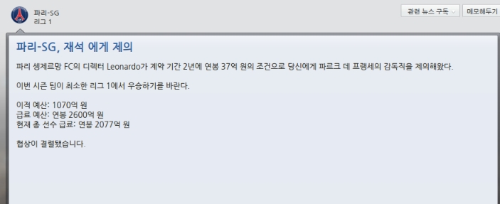 시즌개막전 파리SG의 감독제의가 있었지만 거절했습니다.