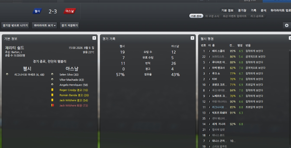 시즌전 열리는 체리티쉴드에서 아스날에 2-3으로 패배하였습니다.